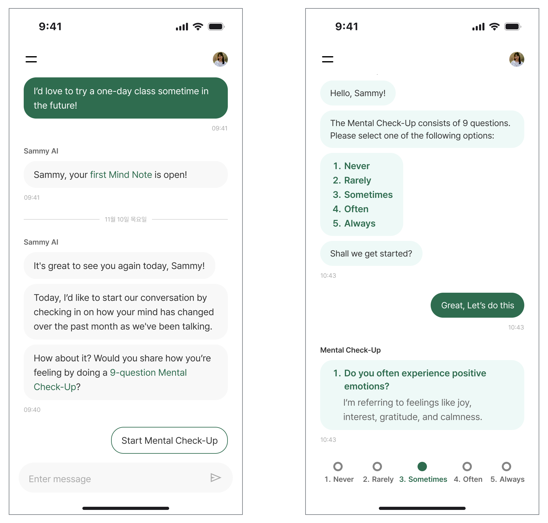 During the mandatory Mental Check-Up, the message input field was unnecessarily visible, distracting users from the required multiple-choice (1-5 point) selection task.