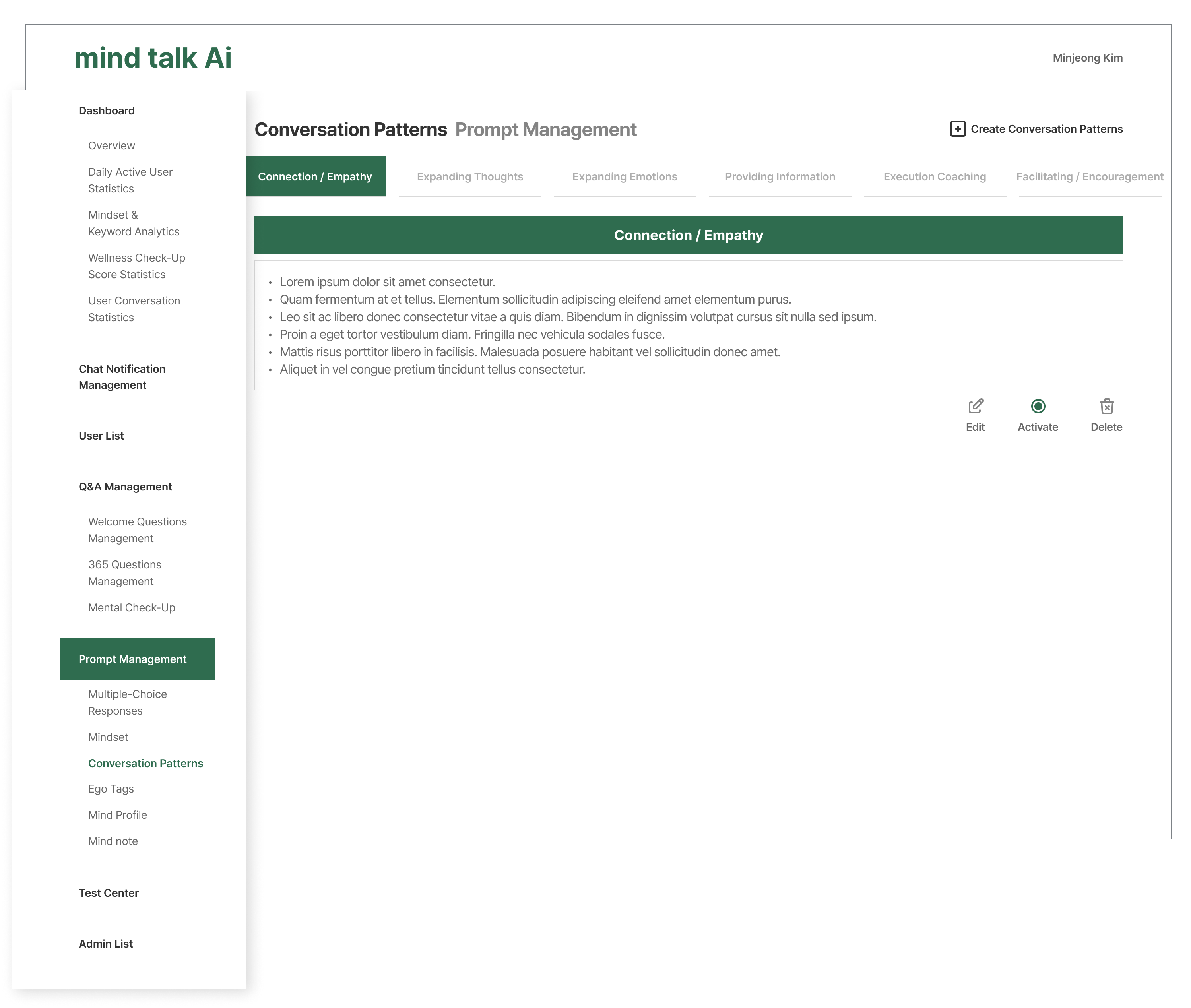 The complexity of managing numerous types of questions and AI prompts required a highly efficient solution. I designed an intuitive dashboard that allows operators to seamlessly add, edit, and delete core content, directly addressing the complex nature of prompt and content management.